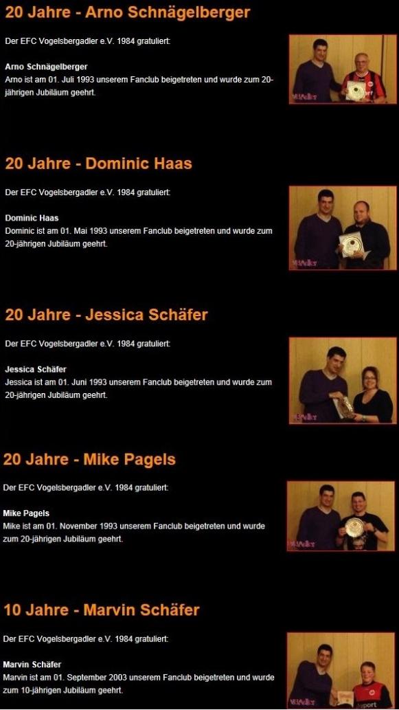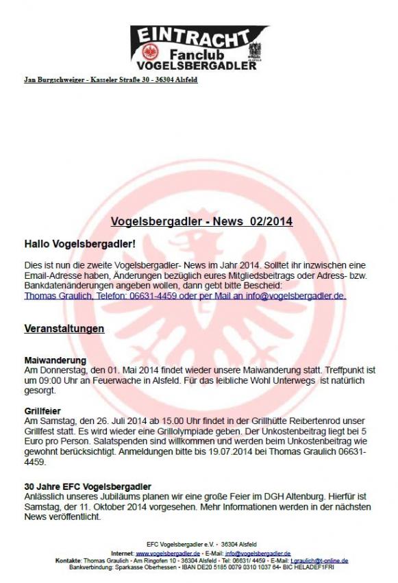 Vor kurzem fand die Jahreshauptversammlung des EFC Vogelsbergadler 1984 e.V. aus Alsfeld in der Gaststätte Zum Rosengarten in Altenburg statt. Hierzu konnte der 1. Vorsitzende Thomas Graulich eine stattliche Anzahl von Mitgliedern begrüßen. Nach einem gemeinsamen Abendessen war seinem Jahresbericht zu entnehmen, dass das Jahr 2013, verbunden mit der UEFA Cup Teilnahme, ein sehr erfolgreiches Jahr für den Fanclub war. Die Mitgliederzahl bewegte sich im Durchschnitt bei 150, die Dauerkartenzahl bei 23 Stück. Auch erwähnte er, dass alle Heimspiele mit dem Bus oder Zug sowie einige Auswärtsspiele besucht wurden. Auch die Anzahl der durchgeführten Veranstaltungen war enorm. Hier sind zu erwähnen: Jahreshauptversammlung, Winterwanderung mit Dartmeisterschaft, Kegelmeisterschaft, Wanderung am 1. Mai auf die Hardtmühle, Grillfest, Weihnachtsfeier. Den Kassenbericht trug Oliver Pagels vor. Er konnte den anwesenden Mitgliedern sehr positive Zahlen präsentieren, was auf eine gute Vereinsführung hinweist. Dem Bericht des Kassenprüfers Markus Körner folgte die Entlastung des gesamten Vorstandes. Da Tina Schäfer noch für ein weiters Jahr als Kassenprüfer im Amt ist, wurde lediglich ein weiterer Kassenprüfer gesucht und in Martina Jakob gefunden. Sie wurde für 2 Jahre gewählt.