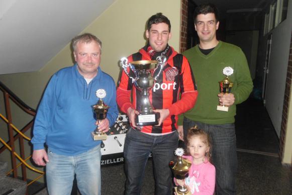 Nach einem harten Kampf holte sich Jona Strack (Mitte) vor Thomas Graulich (links) und Christian Müller (rechts) den Siegerpokal und zusätzlich den Wanderpokal vom Fanclub.