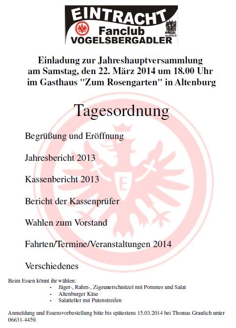Zu unserer diesjährigen JHV am Samstag, den 22. März 2014 laden wir unsere Mitglieder ab 18.00 Uhr in die Gaststätte "Zum Rosengarten" in Altenburg ein. Hier findet ihr die Einladung und die Tagesordnungspunkte.